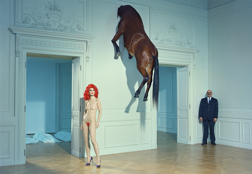The idea for this show – and for the concept of making work ‘after’ that of other artists – was born when Maurizio Cattelan invited Aldridge to stage a photo shoot in his exhibition Not Afraid of Love at La Monnaie in Paris in 2016. Aldridge spent the night in the museum with Cattelan creating his response to Cattelan’s work in his own visual language: bold, statuesque, Valkyrie-like nudes that seem both to haunt and dominate Cattelan’s sculptures of the pope, Hitler and horses in the rococo interiors.