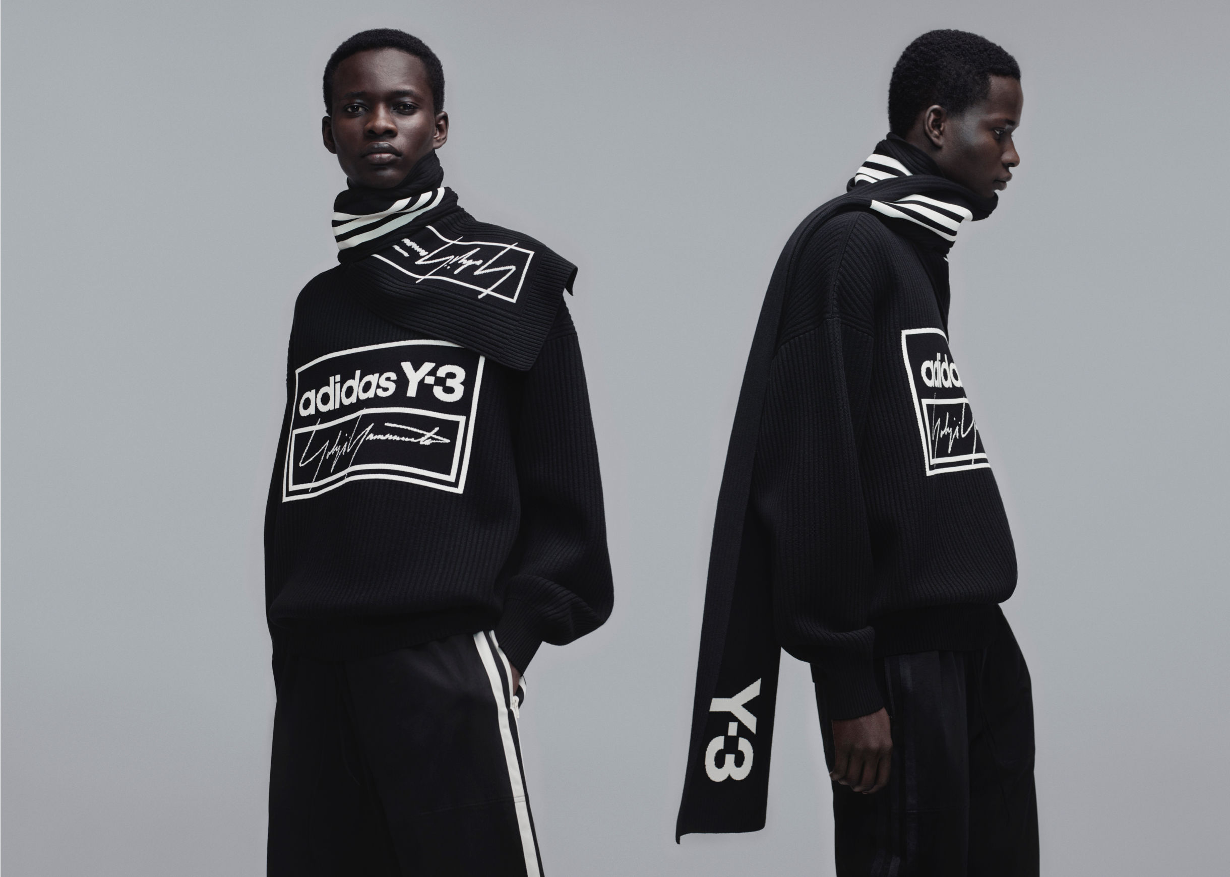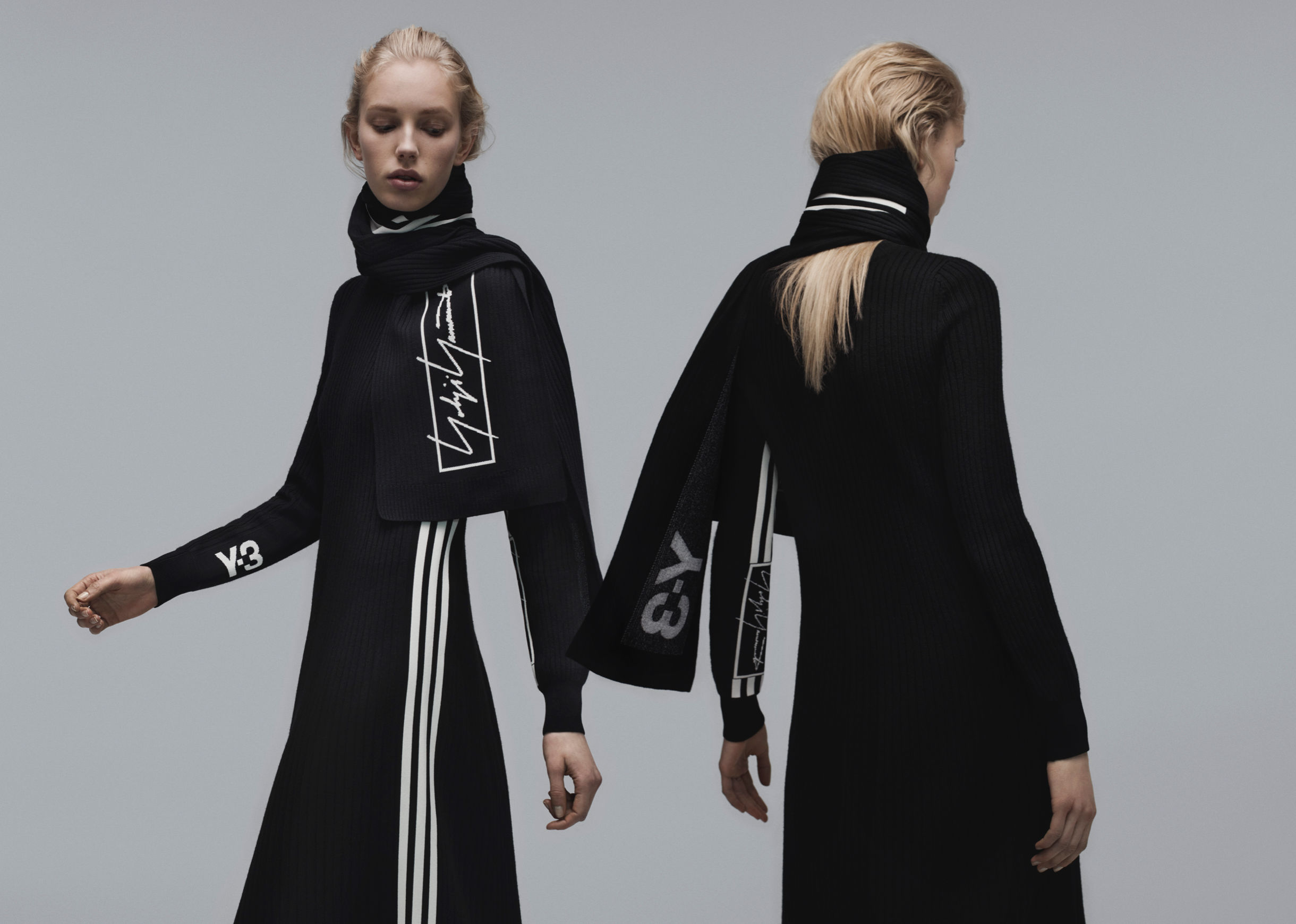 In part two of the Fall/Winter 2019 campaign, themes of contrast and duality are expressed in stark studio imagery that remains true to the signature graphic look of adidas while conjuring a poetic, essential mood that is pure Yamamoto. Against a cool dark gray backdrop, models create bold silhouettes and wear strong, progressive looks; production, technology, and innovation take center stage. Photographed by Yvan Fabing and styled by Marie Chaix, the campaign reveals minimalist technical knit dresses, pants, and sweaters in black and white with contrasting stacked logo motifs — pieces that serve as testament to the power of simplicity.